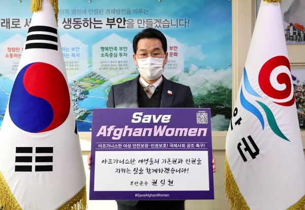 권익현 부안군수가 아프가니스탄 여성의 인권보호와 안전보장을 촉구하는 ‘세이브 아프간 위민(save afghan women)’ 챌린지에 동참했다.
